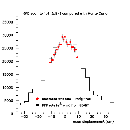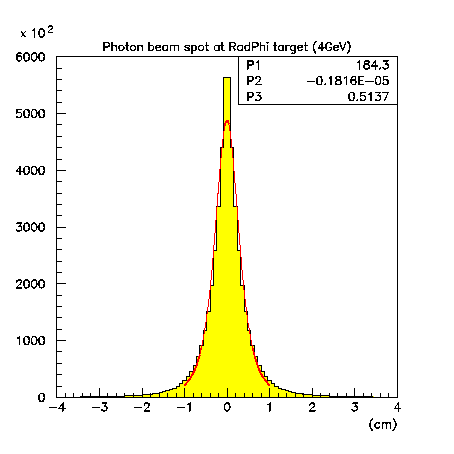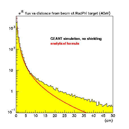 Similar approximations were used for the pair production distributions in the analytic calculation, where again GEANT incorporates more precise descriptions taken from the literature. In spite of these minor differences, the two calculations can provide a check on each other and on the hypothesis that the background seen by RadPhi in 1997 was primarily due to electromagnetic halo around the beam. To compare the Monte Carlo with the simplified formula, I set up GEANT with a thin (10-4 radiation lengths) radiator 40m upstream of the RadPhi target. After travelling inside vacuum for 23.3m the simulated photon beam exited through a 100µm mylar window into air, in which it travelled the rest of the way to the target. The e± flux in the halo around the photon beam at the RadPhi target position is plotted vs distance from the beam axis in Fig. 3. The histogram is the result from GEANT normalised to a tagged rate of 1MHz. The red curve is the analytical result.