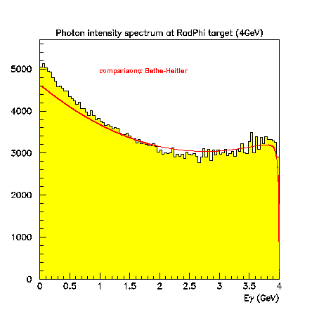 Before the two calculations can be compared, one must check that they are based upon the same physical input. In my analytical calculation I approximated the bremsstrahlung spectrum by the function N0 /k with N0 fixed by the rate in the tagger. The simulation of electron bremsstrahlung in GEANT, based upon the parameterisation of Berger and Seltzer [3], is shown by the histogram in Fig. 1. Photon intensity is defined as the rate times the energy of the photon. Berger and Seltzer go beyond the simple Bethe-Heitler formula (red curve in Fig. 1) to include radiative, screening and Migdal corrections, but the comparison is not bad. The approximation used in the analytic approach would be a rectangular distribution in Fig. 1.