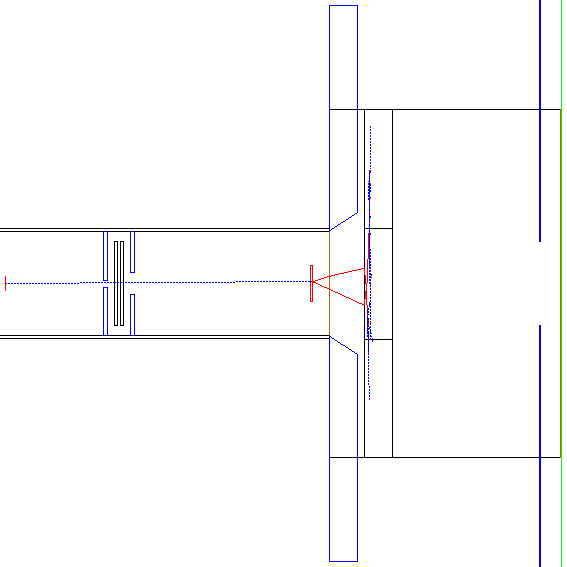 A view of the geometry description used by GEANT in these simulations is shown in Fig. 5. The figure is a planar slice containing the z axis (points to the right) and the y axis (points up). The horizontal scale has been compressed by a factor of 200 and the vertical scale by a factor of 2. The electron beam entering at the left strikes the radiator (red, far left). Tracking of the electron is abandoned when it exits the radiator, and the simulation carries on with any secondaries (eg. bremsstrahlung photons) generated.
