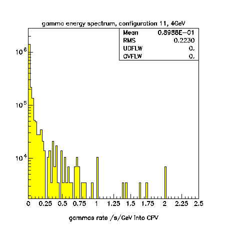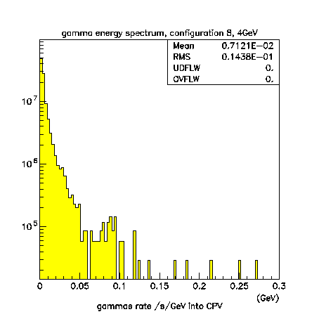 It is apparent that these collimation schemes are more effective at reducing the charged halo than the gamma component. While the level 1 trigger is relatively insensitive to gammas, they might have an adverse effect on the resolution and reconstruction efficiency of clusters in the lead-glass. To examine this question, I plot in Fig. 9 the energy spectrum of the gammas incident on the RadPhi target plane in simulation 8 between 4cm and 50cm from the beam axis (320KHz in Table 1).