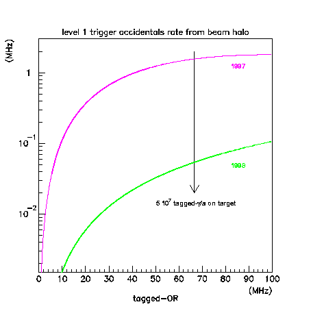 At the end of Ref. [2] I showed the evolution of the level 1 trigger rate from background as a function of the tagger-OR. In Fig. 11 is shown the same calculation compared with the rates under 1998 (configuration 8) conditions. The level 1 trigger is defined as