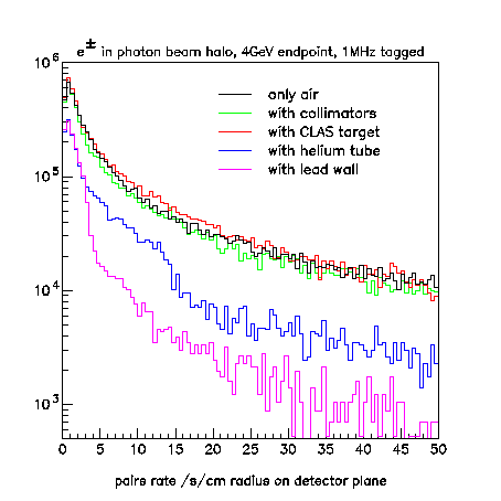 is of paramount importance in reducing the background rate in the RadPhi trigger, as was discovered during the brief running period during the summer of 1997. During that running period with no beamline shielding in place between CLAS and RadPhi, moving the target completely out of the beam had very little effect on the rates in the trigger counters. The experiment has been designed in view of total hadronic trigger rates expected to be of order 20kHz [1] at level 1 with 5·107s-1 in the tagger. Scaled according to tagger rates, the level 1 rate in 1997 was two orders of magnitude greater, which would prohibit running at design luminosity. In a previous study [2] presented at the RadPhi collaboration meeting in Sept. 1997, the background was accounted for in terms of electromagnetic halo (e± pairs) around the photon beam from conversions in the air and other material upstream of our apparatus. That study was based upon an analytic calculation of the electromagnetic preshower in air. As soon as collimation and shielding are introduced, the analytical problem becomes unwieldy, and Monte Carlo provides a more suitable method of solution. In this report I begin by reproducing the results of the analytic calculation with a GEANT-based Monte Carlo program. I then carry out a series of Monte Carlo experiments with this program, trying different collimation and shielding schemes and comparing the results in terms of background trigger rates. The report concludes with a proposal for a shielding scheme that is both simple and effective.
