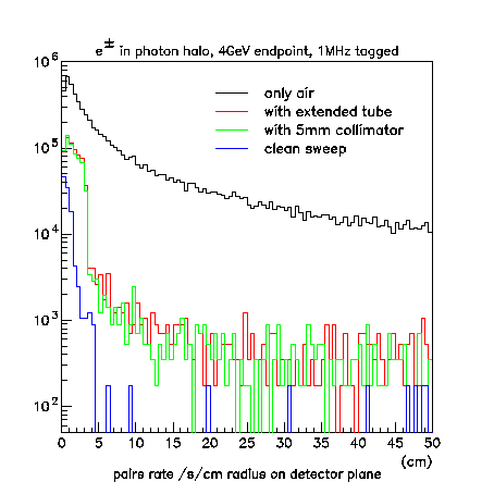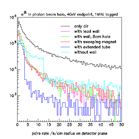 Here the mean photon energy is around 90MeV and the rate above the 100MeV threshold is 9KHz. In this configuration the lead wall is absent and the sweeping magnet is doing the work of shielding. The lead inside the gap of the sweeping magnet is not sufficient to completely absorb the showers and some of the gammas are leaking out into the halo.