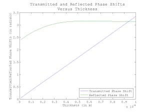 | + | |[[Image:phaseshift.jpg|thumb|Phase shift of the transmitted (linear) and reflected (upper) waves versus thickness of the mirror coating.]] | ||